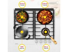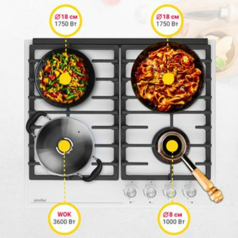 Характеристики Газовая варочная поверхность Simfer H60H41С570 (газ-контроль, WOK конфорка, чугунные решетки, белое стекло)