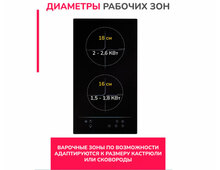 Стильная индукционная варочная панель производителя Simfer H30I72S002 мощностью 4,4кВт имеет две зоны нагрева с разным диаметром, 18 и 16 см, позволяющими использовать посуду с различным диаметром дна.