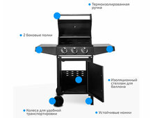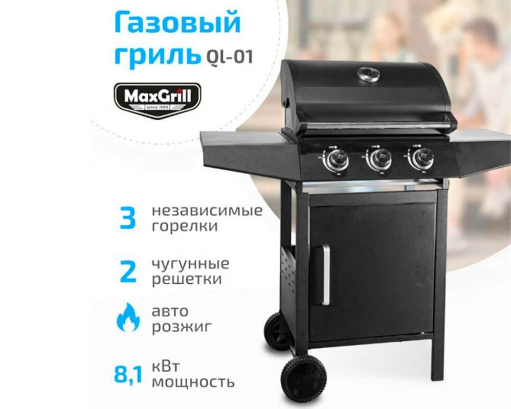 Портативный гриль MaxGrill QL-01 черного цвета оснащен тремя конфорками, выполнен в корпусе